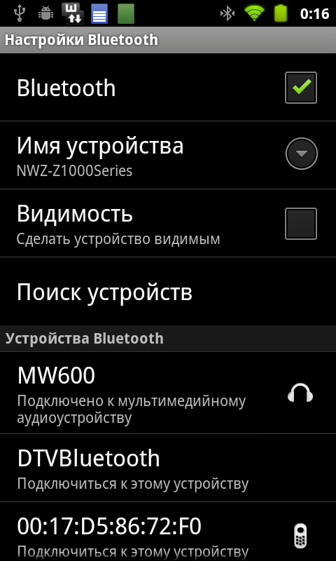 Модуль Bluetooth представлен не в самом своем свежем варианте. С его помощью плеер удалось соединить с беспроводной стереогарнитурой Sony-Ericsson W600, и проблем в работе тандема не возникло. Из особенностей взаимодействия двух родственных устройств стоит лишь отметить, что на экране гарнитуры не отображались названия треков.