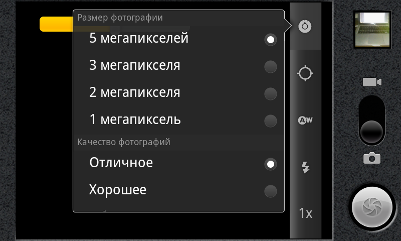 Программа управления камерой встроена в операционную систему и имеет стандартный внешний вид. В правой части экрана находятся значки основных настроек съемки и кнопка «спуска затвора». Самих настроек немного: разрешение снимков (максимум 2560×1920 пикселей), баланс белого, вспышка, запись GPS меток, программный «зум», цветовые эффекты, коррекция экспозиции, ISO.