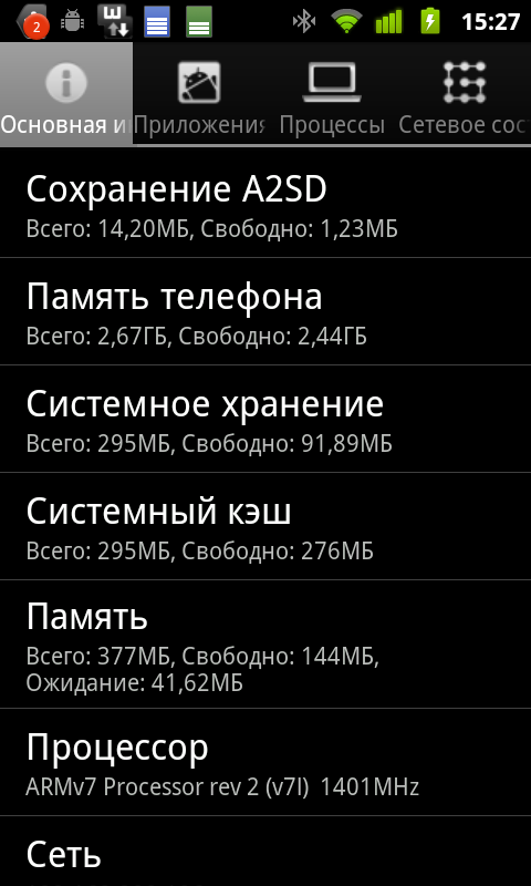 Объем оперативной памяти, по нынешним меркам, в ZTE Blade+ невелик — 512 МБ. Из них незанятыми системой остались лишь 377 МБ.