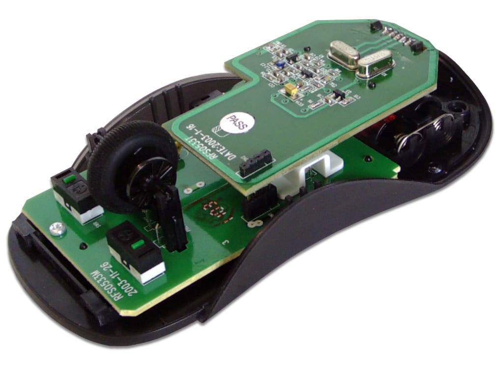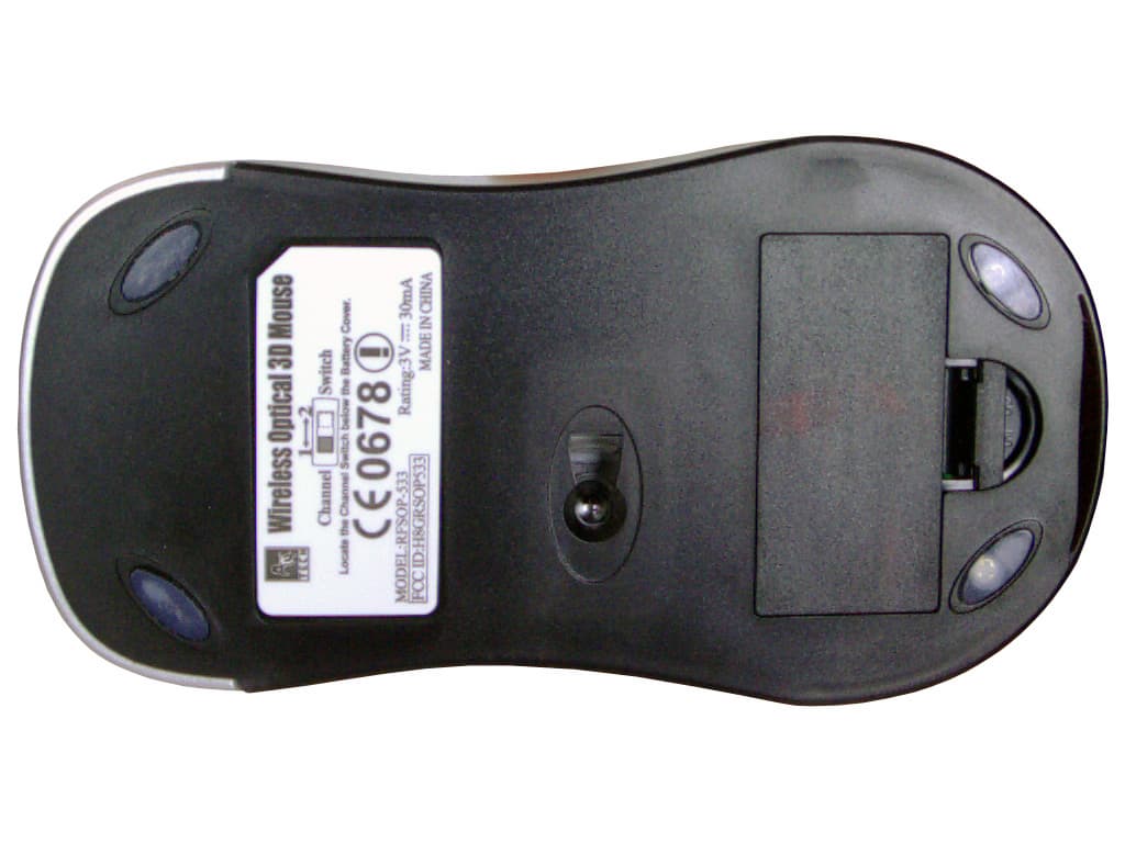 Внутренности RFSOP-533 вполне обычны для беспроводных радиомышей. Электрическая схема устройства собрана на двух печатных платах, одна из которых несет на себе элементы, относящиеся собственно к самой мышке, а вторая к ее радиотракту. Питание осуществляется от двух аккумуляторных батарей ААА, за счет чего общий вес устройства невелик. Зарядка этих аккумуляторов в самой мыши не предусмотрена, но в комплекте их поставляется четыре штуки. Это подразумевает непрерывную работу мыши без остановки на время зарядки аккумуляторов, так как пока два из них заряжаются в приемнике, два оставшихся работают в самой мышке.