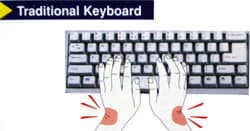 Поле буквенных кнопок как бы поделено пополам, но в отличие от «гнутых» эргономических клавиатур, образовавшиеся в результате этого деления массивы не отнесены друг от друга. Кнопки 6, Y, H, и N, серого цвета и трапециевидной формы, они как бы разделяют эти массивы. Остальные кнопки имеют ярко выраженный наклон в сторону этих четырех «разделительных» кнопок. Необычно, не правда ли? И не только необычно, но и весьма удобно. Я не буду описывать словами, какую именно цель преследовали дизайнеры данной клавиатуры, а вместо этого приведу фотографии фрагментов коробки, которые, я надеюсь, и будут ответом на вопрос: "А зачем так извращаться над клавиатурой?".