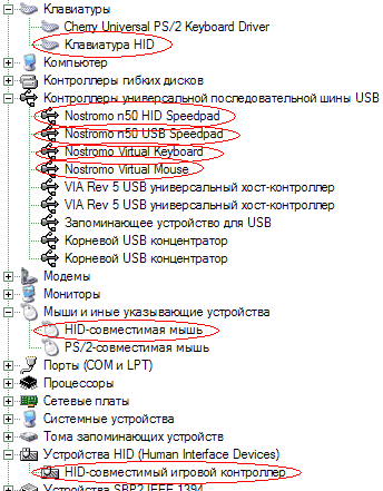 Подключив Nostromo n50 к компьютеру и установив прилагающееся программное обеспечение мы получаем целую кучу новых устройств: вторую клавиатуру, вторую мышь, устройство HID и четыре USB-устройства (два из них как раз виртуальные клавиатура и мышь). Почему все выглядит именно так, а не иначе, объяснено выше.