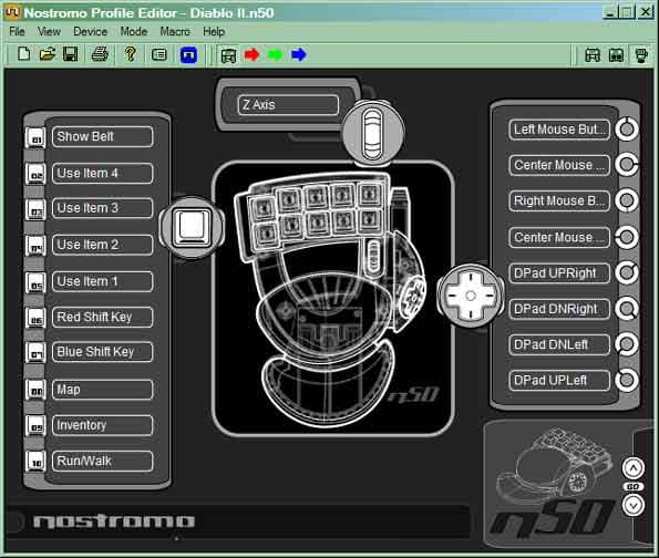 Первое, что было проверено Diablo II. Профиль для этой игры берет на себя клавиатурные команды, а также нажатие кнопок мыши. Вот последнее в данном случае немного излишне, хотя… как сказать: при хождении на дальние дистанции удобнее нажать и удерживать в одном положении пад, а не левую кнопку мыши. А вот эмуляция клавиатуры это очень хорошо: кнопки, задействованные в Diablo II, разбросаны по всей клавиатуре, а при использовании n50 мы получаем их компактно собранными в одном месте.