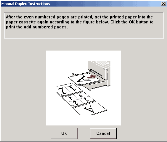 Если выбран режим дуплекса, то открывающееся при печати диалоговое окно покажет, как надо правильно расположить листы в лотке принтера (ручной дуплекс).