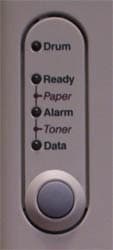 Зеленый огонек (Ready) говорит о том, что принтер готов к труду и обороне, желтый (Data) оповещает о том, что идет процесс передачи данных. Красный (Alarm) в сочетании с одним из вышеназванных предупреждает об отсутствии тонера или о заедании/отсутствии бумаги неплохое решение, позволяющее не загромождать кучей лампочек принтер. Верхняя лампочка (Drum) напомнит о необходимости замены барабана.