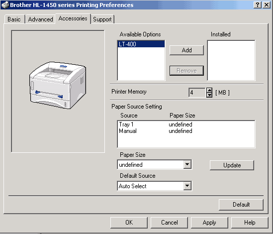 Третья закладка посвящена настройке аксессуаров. Если вам недостаточно 250-листового лотка автоподачи бумаги, то, купив второй, можно довести запас до 500 листов. Здесь же настраиваются и такие аксессуары, как ИК-порт и Сервер печати внешние устройства, подключаемые к принтеру.