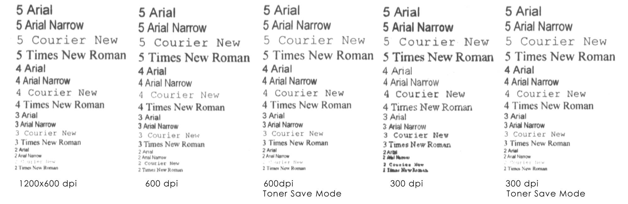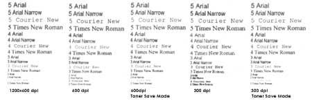Заметно практическое отсутствие разницы в толщине шрифтов Arial и Arial Narrow на 3 кегле, легко различимое при 1200х600. Получается, что принтер приближает написание букв к возможностям 600 dpi и не пытается превзойти себя, как это было в предыдущем случае. В результате прекрасно читаемы все шрифты при всех размерах.