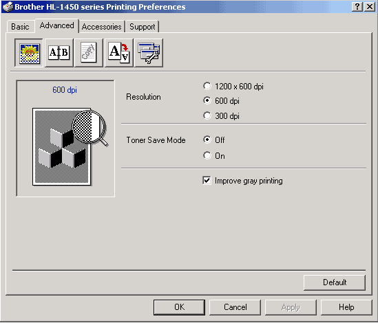 Первый из них посвящен настройке разрешения и режима экономии тонера. Так же здесь расположен параметр Improve Grey Printing (только Win2000/XP) более подробно о нем будет рассказано в описании качества печати.