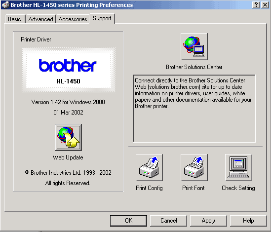 Закладка Support поможет одним нажатием кнопки обновить драйверы или попасть на страницу Brother в сети.