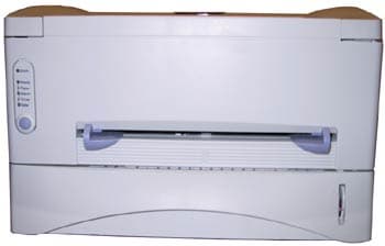 Спереди мы видим набор диодов, показывающих состояние принтера, универсальную кнопку, щель для ручной подачи бумаги и, что интересно, справа внизу датчик бумаги в лотке. Информативность этого датчика невелика, но он позволит, не заглядывая в лоток, отличить 100 листов запаса от 50, что облегчает жизнь тех, кому приходится печатать много и часто.