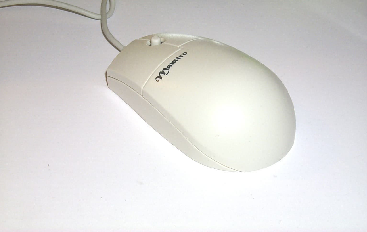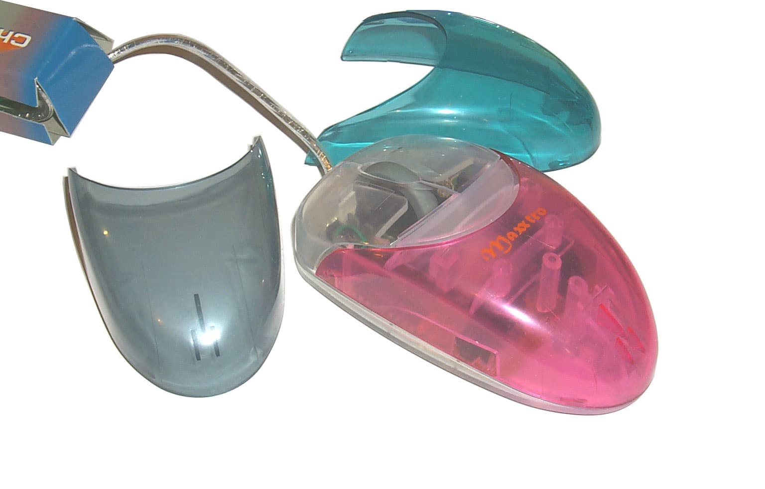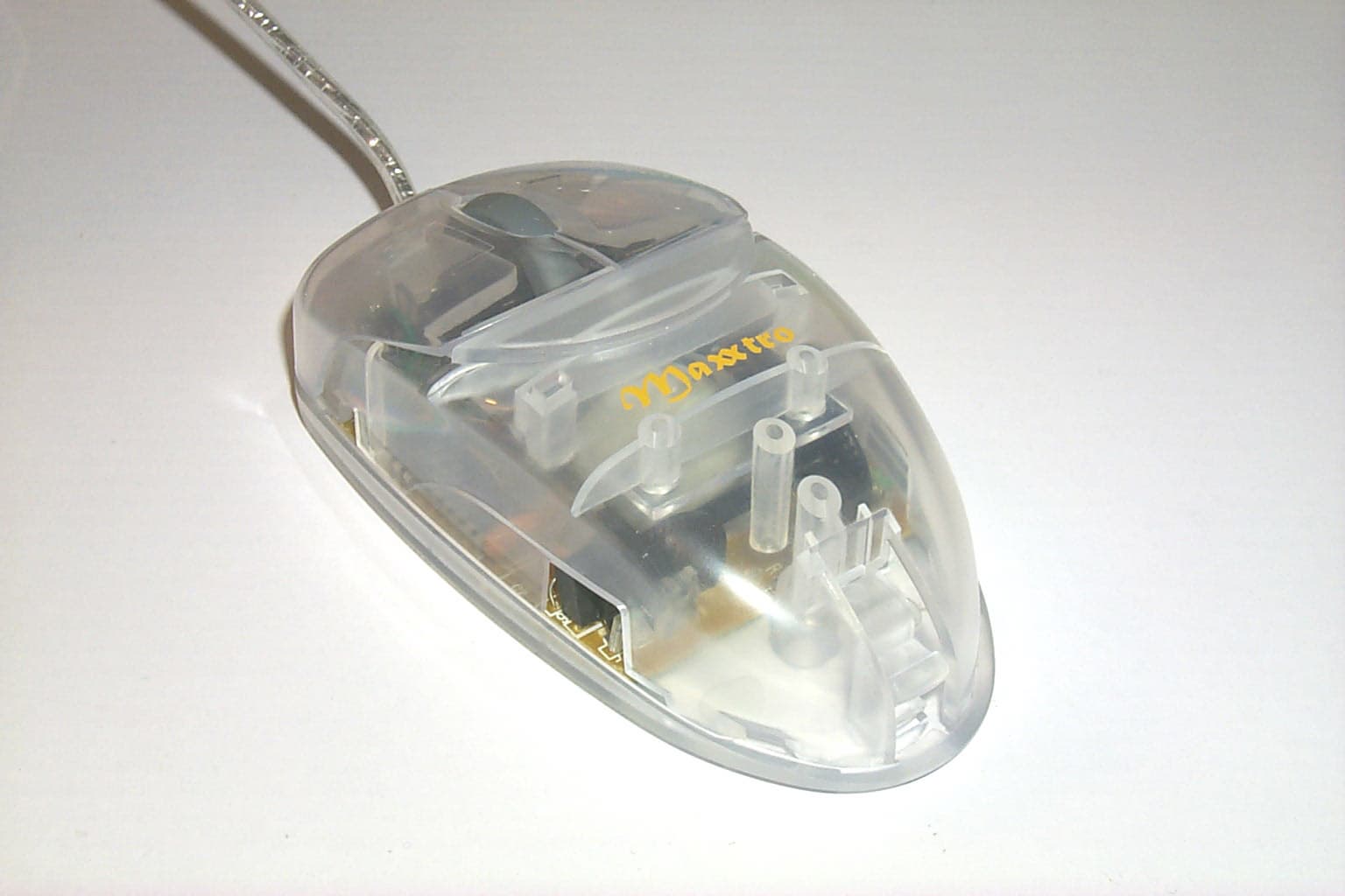 Самая необычная мышь, выделяющаяся из всего набора не только внешним видом, но и функциями, открывает список колесных мышей с программируемыми дополнительными кнопками. Мышь имеет обтекаемую симметричную форму, которая подходит для использования мыши как правой, так и левой руками. Достаточно удобно лежит в руке. Начинаясь с широких кнопок, благодаря чему пальцы лежат свободно, корпус мыши постепенно сужается к концу. Мышь имеет две кнопки и колесо между ними, которое дополнительно используется как третья программируемая кнопка. Дискретно прокручивающееся колесо выполнено из нескользкой резины темно-серого цвета. Корпус сделан из прозрачной дымчатой пластмассы белого цвета, в то время как кнопки имеют легкий сиреневый оттенок. Главная особенность внешнего вида этой мышки — ее умение менять цвет. В комплекте идут три прозрачные сменные пластмассовые крышки трех различных цветов: красный, темно-синий или скорее серо-синий и изумрудный. Нажатием на защелку, которая располагается на нижней задней части мыши, крышка снимается и заменяется на другую. В центре на корпусе виден логотип Maxxtro, нарисованный желтым цветом, что очень хорошо сочетается со всем цветовым разнообразием сменных корпусов. Эта мышь имеет самый короткий интерфейсный кабель из всей серии мышей — всего 1.42м, но вместе с тем и самый яркий — мягкий, гибкий, блестящий, с прозрачным покрытием. Заканчивается он, как и полагается, PS/2 разъемом зеленого цвета.