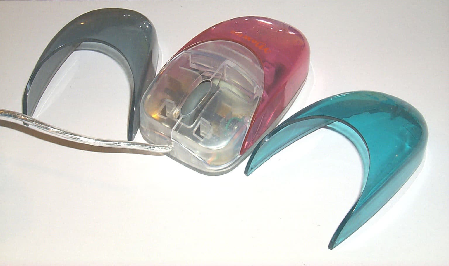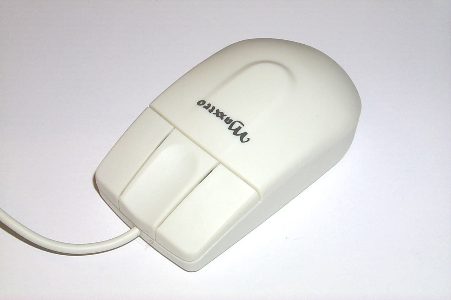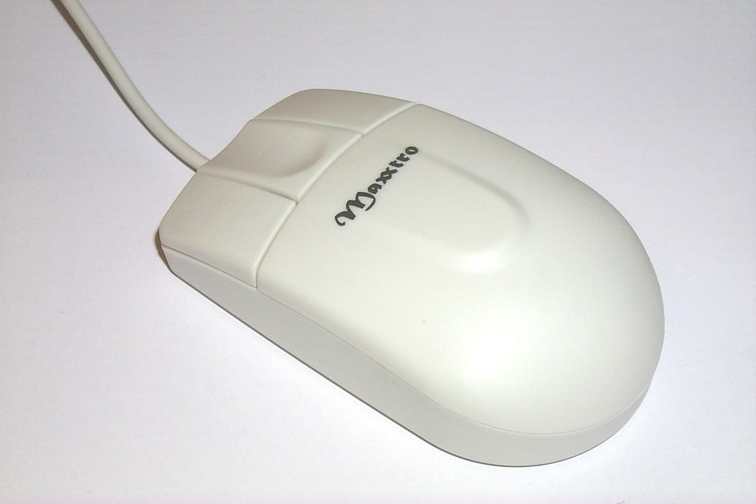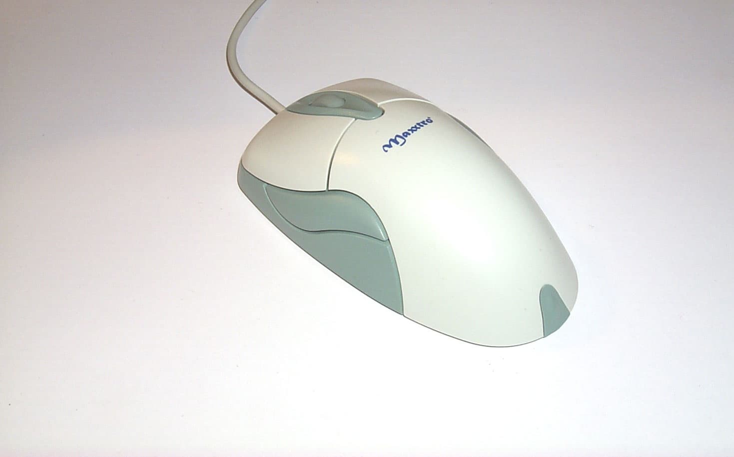 Самая необычная мышь, выделяющаяся из всего набора не только внешним видом, но и функциями, открывает список колесных мышей с программируемыми дополнительными кнопками. Мышь имеет обтекаемую симметричную форму, которая подходит для использования мыши как правой, так и левой руками. Достаточно удобно лежит в руке. Начинаясь с широких кнопок, благодаря чему пальцы лежат свободно, корпус мыши постепенно сужается к концу. Мышь имеет две кнопки и колесо между ними, которое дополнительно используется как третья программируемая кнопка. Дискретно прокручивающееся колесо выполнено из нескользкой резины темно-серого цвета. Корпус сделан из прозрачной дымчатой пластмассы белого цвета, в то время как кнопки имеют легкий сиреневый оттенок. Главная особенность внешнего вида этой мышки — ее умение менять цвет. В комплекте идут три прозрачные сменные пластмассовые крышки трех различных цветов: красный, темно-синий или скорее серо-синий и изумрудный. Нажатием на защелку, которая располагается на нижней задней части мыши, крышка снимается и заменяется на другую. В центре на корпусе виден логотип Maxxtro, нарисованный желтым цветом, что очень хорошо сочетается со всем цветовым разнообразием сменных корпусов. Эта мышь имеет самый короткий интерфейсный кабель из всей серии мышей — всего 1.42м, но вместе с тем и самый яркий — мягкий, гибкий, блестящий, с прозрачным покрытием. Заканчивается он, как и полагается, PS/2 разъемом зеленого цвета.