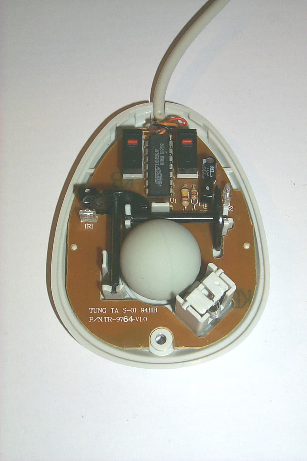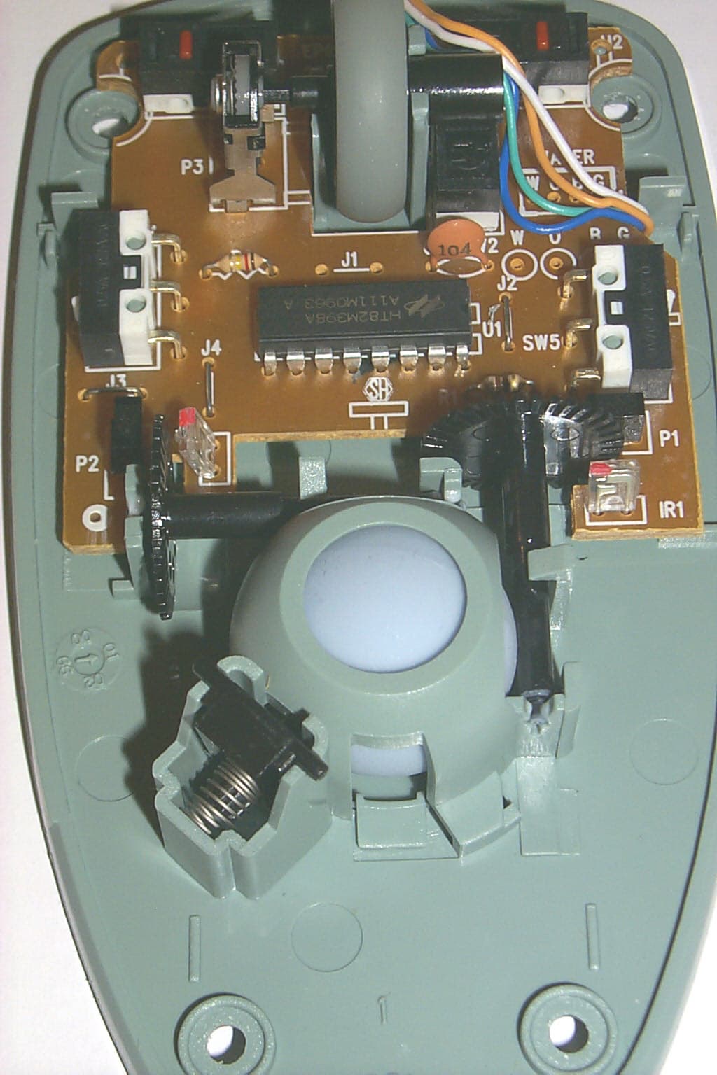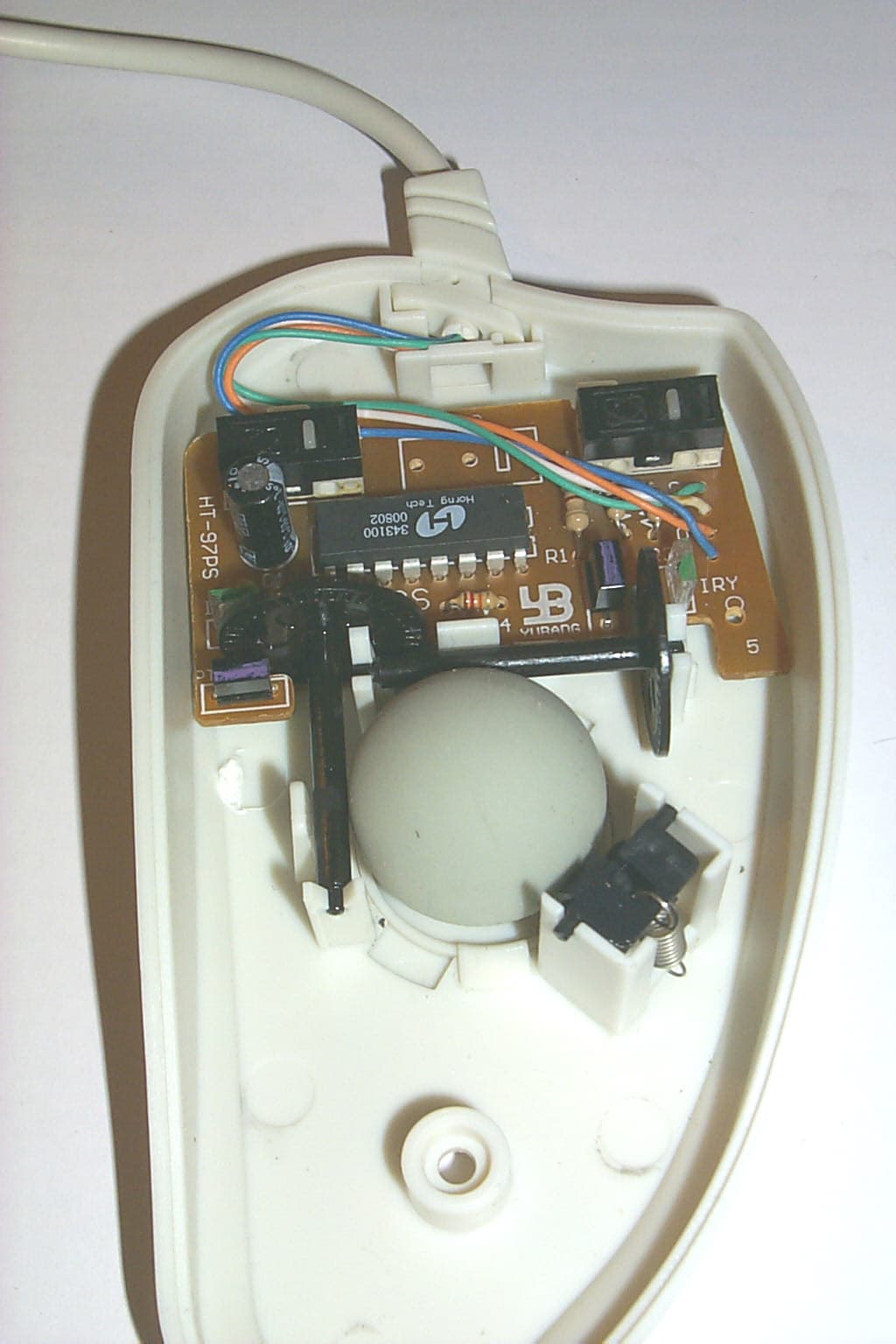 Отвинтив один винт и сняв крышку, мы увидим внутри мышки плату все той же фирмы YUBANG, на которой располагаются два микропереключателя DM1, но не от IC, а от третьего производителя, что заставляет усомниться в их качестве. Сердцем данной модели является чип Horng Tech 343100. Четыре провода интерфейсного кабеля запаяны на плату без разъема, а сама плата прикреплена к нижней части корпуса мышки тремя фиксирующими защелками.