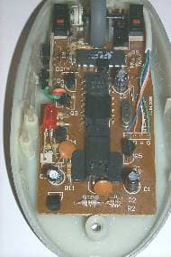 Крепится нижняя часть корпуса на одном винте. Внутри — плата, на которой расположены два микропереключателя LH-98, чип EMC EM84502AP и пять проводов интерфейсного кабеля, запаянных на плату без разъема. Стик располагается в головной части мышки на отдельной плате, крепящейся к основной посредством четырех защелок и соединяющейся с ней посредством пяти-проводного шлейфа.