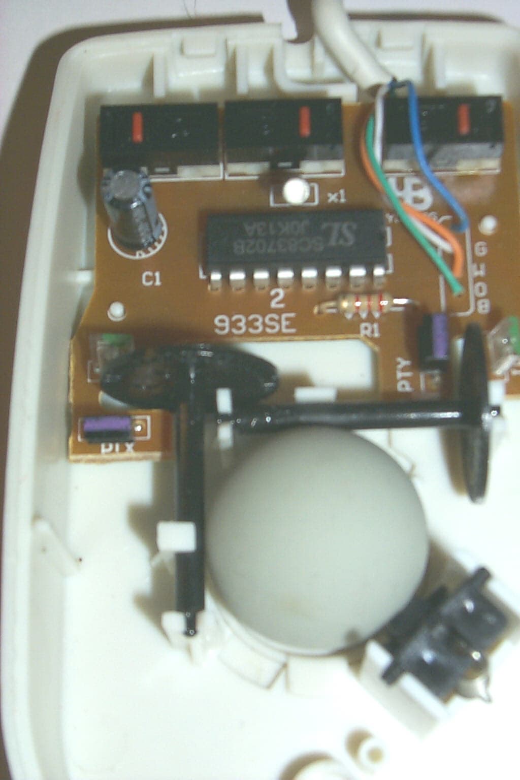 Отвинтив один винт и сняв крышку, можно рассмотреть плату фирмы YUBANG, на которой располагаются три микропереключателя, чип SL SC83702B и четыре провода интерфейсного кабеля, запаянных на плату.