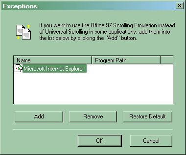 Интересным является и самый верхний пункт на этой закладке, позволяющий выбрать тип скроллинга: во всех приложениях или только в специально рассчитанных на него. В принципе, такой выбор доступен практически во всех вариантах мышиного софта (кроме Microsoft IntelliPoint, разумеется), но там он слишком грубый либо так, либо эдак. Cherry же позволяет переопределить глобальное значение для отдельных приложений. Для этого достаточно лишь нажать кнопку Exceptions... и задать список приложений. Отмечу, что побочным эффектом этого является возможность отключения скроллера в отдельных программах если внести в список приложение, напрямую не поддерживающее прокрутку колесиком (данную возможность, кстати, я разве что в IntelliPoint до этого встречал).