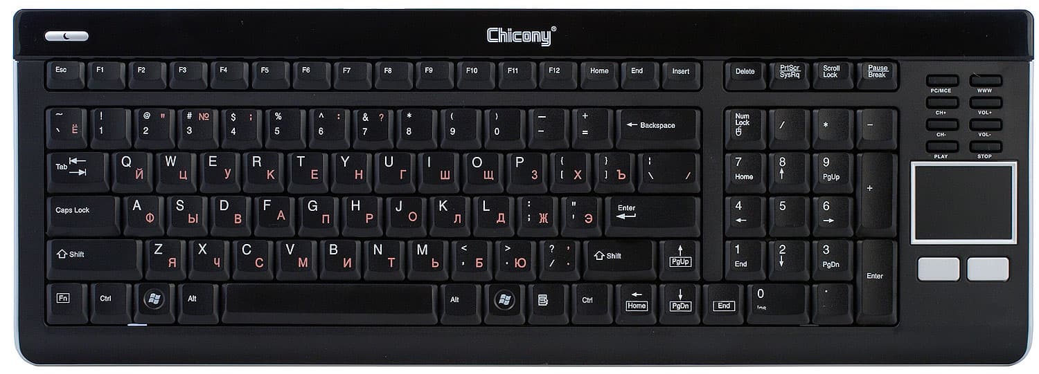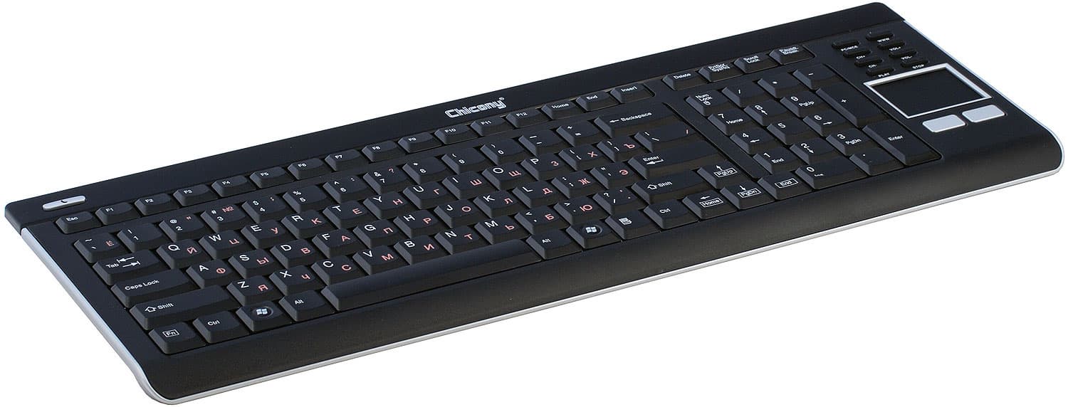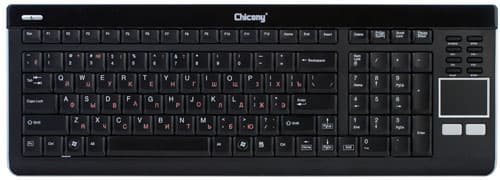 К этому же классу относится и рассматриваемая сегодня радиоклавиатура Chicony KGR-0609 — при наличии стола она проиграет традиционным беспроводным наборам, зато на диване столь же неминуемо у них выиграет. Особенно в тех случаях, когда требуется не только клавиатура, но и заменитель мыши, роль которого в данной модели выполняет привычный по ноутбукам тачпад.