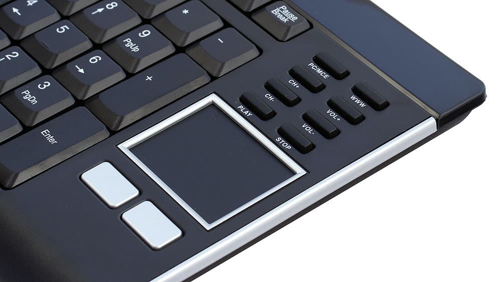 По вполне понятным причинам, клавиатура, которую чаще всего будут держать в руках или, в лучшем случае, на коленях, должна быть достаточно компактной — пусть даже в ущерб количеству и «качеству» клавиш. Странно, что об этих важных характеристиках компания молчит, хотя стесняться ей нечего — согласно нашим измерениям, клавиатура имеет размеры примерно 445×155 мм при толщине в самой толстой части 2 см, что очень даже немного, если учесть наличие не только тачпада, но и дополнительного цифрового блока (которого в упомянутых выше моделях не было). Благодаря этому, а также наличию откидывающихся ножек, клавиатура будет не так уж и плоха при настольном использовании, особенно для тех, кто все равно не пользуется блоками управления курсором и редактирования, предпочитая им NumPad (таковых, кстати, среди старых пользователей компьютеров, «зацепивших» еще 80-е годы, большинство). В общем, если рассматривать устройство именно как клавиатуру, то по сравнению с более старыми моделями того же класса наблюдается заметный прогресс.