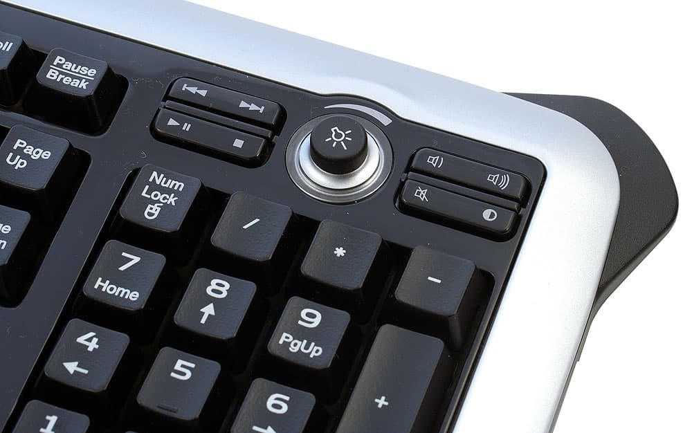 Несмотря на то что дополнительные кнопки в глаза особо не бросаются, их количество вполне соответствует духу времени :) На первый взгляд — четыре, а если приглядеться, то все восемь, поскольку каждая является двухпозиционной. Левые две «качельки» управляют воспроизведением файлов в плеере, правые полторы — громкостью звука. Почему полторы? Дело в том, что половинка нижней вместе с расположенным по центру вращающимся регулятором управляют подсветкой, так что о них чуть позже. Ну а оставшиеся семь позиций в особых пояснениях не нуждаются, благо их назначение очевидно по маркировке даже для человека, ранее с мультимедийной клавиатурой не сталкивавшегося.