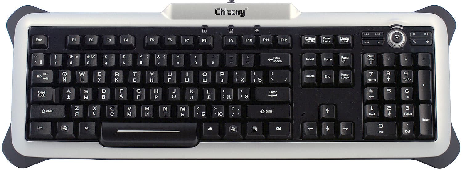 На первый взгляд клавиатура производит несколько архаичное впечатление — все-таки мы уже начали привыкать к моделям с уменьшенным ходом клавиш. Среди клавиатур с подсветкой таких и вовсе подавляющее большинство. Да и дополнительных кнопок на современных устройствах ввода обычно достаточно много, причем в самых разных местах. Здесь же последние скромно поместились в правом верхнем углу, клавиши основных блоков очень высокие, а раскладка всех блоков полностью традиционная. С одной стороны — несовременно, с другой же стороны — данная несовременность может, наоборот, сослужить клавиатуре хорошую службу: если она попадется на глаза человеку, которого во всем устраивают «обычные» недорогие модели, и единственное, чего в них не хватает, так это как раз подсветки.