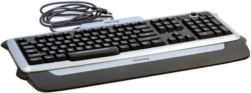 По размерам устройство довольно большое (526×175×28 мм без подставки для запястий), поскольку никто не пытался сделать клавиатуру компактной — ее сила как раз в традиционном дизайне. Родом где-то так из конца 90-х: тогда львиную долю продаваемых моделей составляли типовые мембранные клавиатуры, к которым в массовом порядке начали прикладывать отстегивающуюся подставку для запястий. За исключением уже упомянутой подсветки, от тех устройств KUP-0603 заметно лишь отличается цветом, отсутствием кнопок управления питанием (к которым большинство пользователей так и не сумело приноровиться), да углом наклона. Вот последний оказался одной из неприятных неожиданностей — фактически в устройстве передний край толще заднего, так что ножки, добавляющие заднему краю почти 2 см высоты, позволяют поверхности клавиш всего лишь немного отклониться от горизонтали в «правильную» сторону. Хотя, может быть, это мы такие старомодные люди, и в отрицательном угле наклона есть свои положительные особенности, но во время тестирования их обнаружить не удалось. Особенно с учетом большой высоты самих клавиш. Так что ножки — в данном случае никак не роскошь, а насущная необходимость.