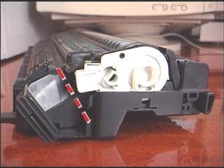 Всю процедуру рекомендую проделать только единожды. Во-первых, как уже было сказано, герметичность поролоновых прокладок с каждой разборкой будет снижаться. Во-вторых, слишком это все муторно. Поэтому, разобрав картридж, можно его слегка доработать, а далее пользоваться плодами своего труда: срезаем часть корпуса в районе расположения пробки от тонера, делаем несколько отверстий на нижней части бункера (обычно три по количеству внутренних отделений) и заклеиваем их скотчем. Проследите, чтобы опилки не остались внутри картриджа.