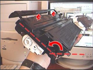 Шаг 4. Вскрываем картридж. В данный момент есть риск рассыпать тонер, так как при разделении верхней и нижней крышки у нас не остается бункера как такового, в котором бы находился отработанный порошок, но при аккуратных действиях все должно получиться чисто: