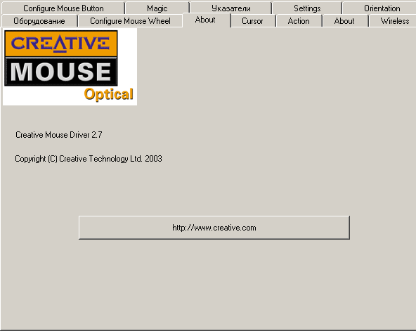 Наконец, закладка About, при помощи которой мы можем узнать версию мышиного драйвера, а также сходить на сайт Creative.