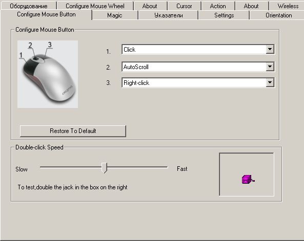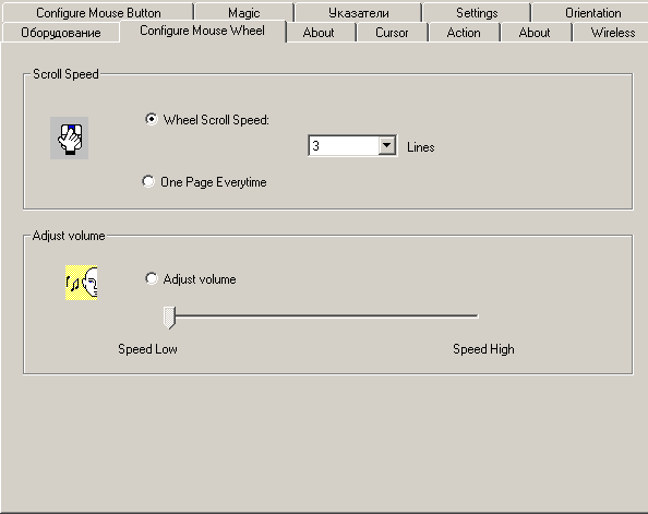 Апплет управления мышью обогатился тремя новыми закладками (не пугайтесь их общего количества на скриншотах у меня была подключена еще Genius Wireless NetScroll+ Superior и установлено ее ПО). Первая позволяет настраивать кнопки мыши. Ее целесообразность я так и не понял: список возможных вариантов маленький, но, будь он большим, кто станет перенастраивать кнопки обычной трехкнопочной мыши, если они очень давно и без того имеют свое назначение? Если бы компания не пожалела включить в набор свою топовую беспроводную мышь (Mouse Wireless Optical 5000), был бы другой разговор, а у имеющегося грызуна кнопки настраивать дело неблагодарное.