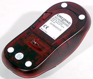 Те, кто успел привыкнуть к последним бесхвостым красавицам от Logitech, A4 Tech или Genius, скорее всего, будут разочарованы внешностью мыши от Creative, да и менее избалованным пользователям восторгаться в ее случае нечем. Достаточно невзрачная модель симметричного дизайна. Имеет две стандартные выделенные кнопки и ребристое колесико прокрутки, по совместительству служащее третьей кнопкой. Единственная отличительная особенность — габариты не сильно отличаются от проводных мышей, особенно по ширине (126 х 64 х 41 мм при массе 87 грамм). Впрочем, это меня не удивило, поскольку тем же могла похвастаться и Creative Optical. Там нужный эффект достигался размещением батарейного отсека под сдвигающейся верхней крышкой, здесь же ничего похожего нет, значит был реализован другой подход. Перевернем мышь.
