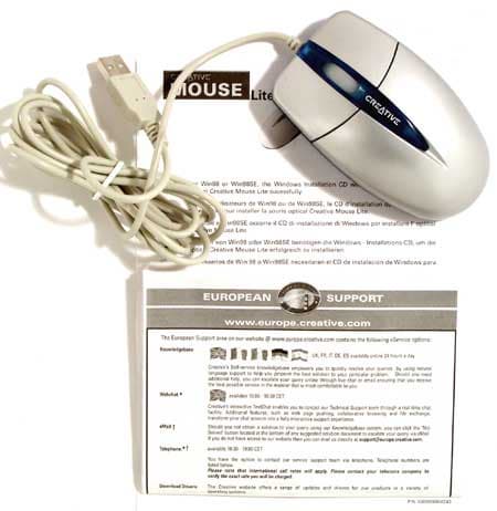 Коробка невелика, но выглядит достаточно красиво (что традиционно для Creative). Из нее на свет божий извлекается достаточно бедный (для коробочной мыши) набор: она сама да две бумажки. Последние разительно отличаются друг от друга: инструкция в виде одного печатного листа на все языки и толстенькая брошюрка, посвященная технической поддержке продукта. Сразу видно, на что делался основной упор :) Почему нет никаких дисков? Дело в том, что мышь имеет всего три кнопки и колесико прокрутки, так что в операционных системах начиная с Windows 98 будет превосходно работать без какого-либо дополнительного программного обеспечения. А на более ранние системы мышь просто не рассчитана, поскольку USB они не поддерживают.