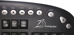 Справа расположена самая большая группа дополнительных кнопок, предназначенная для управления медиаплеерами: Play/Pause, Stop, Previous-Track, Next-Track, Eject (для открытия/закрытия привода CD). Еще правее помещены кнопки системного назначения: LogOFF (завершение сеанса пользователя), переход в спящий режим и выключение компьютера.