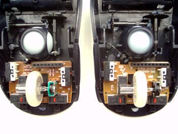 Разница небольшая, но все же, в Defender 1210 установлены печатные платы более поздней версии, нежели в мышке от Maxxtro. Означает ли это, что улучшились параметры работы, мы узнаем позже, а пока продолжим рассмотрение устройства. Как видно на фотографиях, изменились только печатные платы и, как следствие, набор компонентов электрической схемы. К сожалению, используемые в Defender 1210 микропереключатели ничем не отличаются от микропереключателей, используемых в сестричке Maxxtro, и лучше не стали. Не изменилась и система, отслеживающая вращение колеса прокрутки. Она осталась механической и, соответственно, намного менее долговечной, нежели аналогичная система, построенная на оптоэлектронных парах. Само колесо прокрутки, в сравнении с мышью Maxxtro, никаких изменений не претерпело. Качество сборки, в общем-то, не изменилось. Разве что, немного аккуратнее выполнены прорези в верхней печатной плате, предназначенные для дисков оптико-механической системы мыши.