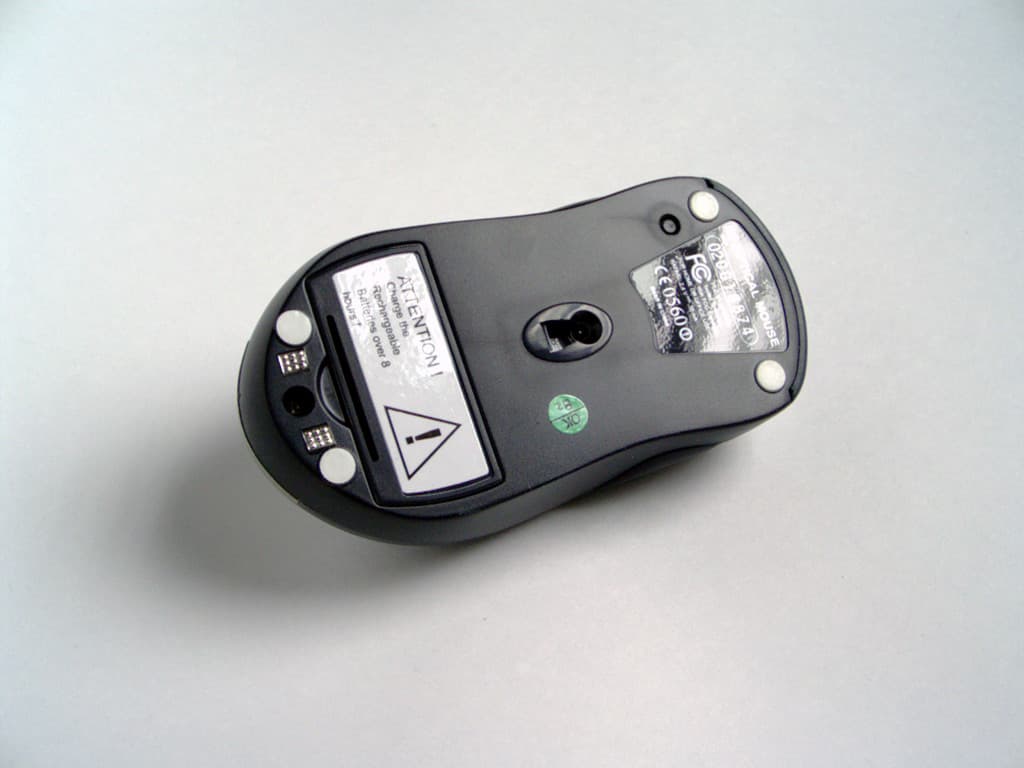 На нижней крышке Defender 1400 расположены второстепенные органы управления и батарейный отсек, рассчитанный на установку двух аккумуляторных батарей ААА. В комплекте с мышью поставляются Ni-MH аккумуляторы YUASA DELTA емкостью 700 mAh. Также под крышкой батарейного отсека расположен переключатель радиоканала, на котором будет работать мышь. На самой поверхности нижней крышки корпуса располагается кнопка Connect и две контактных площадки для питания мыши от зарядного устройства во время зарядки аккумуляторных батарей.