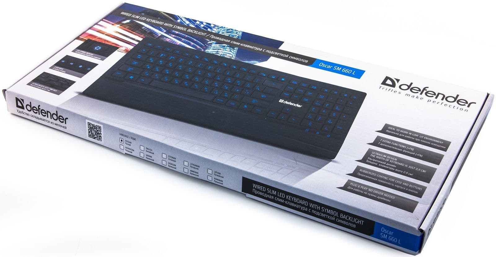 Еще одним из достижений прогресса стало резиноподобное матовое покрытие софт-тач (soft-touch), начавшее свой путь с кнопок калькуляторов и пультов дистанционного управления, а с распространением мобильных технологий получившее массовое применение на корпусах смартфонов и планшетов. Компьютерным устройствам ввода куда чаще приходится соприкасаться с руками пользователя, тем не менее, если на мышах и геймпадах софт-тач можно встретить достаточно часто, то в клавиатурах его применение, как правило, ограничивается подставками для рук и элементами корпуса, обходя непосредственно кнопки. Тем интереснее оценить, что получилось у Defender в модели под названием Oscar SM-660L, где это покрытие использовано по максимуму.