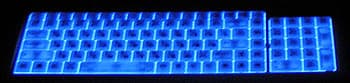 На первый взгляд перед нами типичная слимовая клавиатура размером 435 x 170 x 26 мм, с раскладкой как у Obsession. Механика, впрочем, на современном уровне — подобно Fabulous производитель гарантирует до 10 миллионов нажатий на клавиши. Выглядит она в «обычном» режиме просто и непритязательно: серый пластик корпуса, клавиши из полупрозрачной белой пластмассы производят несколько «игрушечное» впечатление, из общего ряда выделяется разве что синий цвет светодиодных индикаторов. Однако главная особенность клавиатуры заключается в том, что источниками света являются не только индикаторы, но и сам клавишный блок. В клавиатуре применены электролюминесцентные лампы подсветки, включающиеся единственной дополнительной клавишей (расположенной в правом верхнем углу основного блока). При включении подсветки все клавиши начинают светиться мощным голубым светом, что позволяет работать без дополнительных источников освещения, да и вообще — смотрится очень экстравагантно (ау, моддеры! :)).
