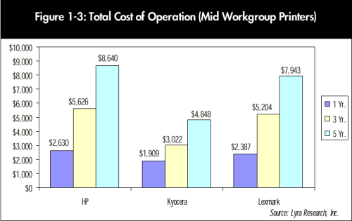 Отчет независимого аналитика Lyra Research, Inc., проведшего испытания принтеров различных производителей с целью оценить общую стоимость владения подтвердил вывод Context о наибольшем вкладе расходных материалов в расходы на печать. Отчет целиком можно найти на этой странице. Приведем лишь одну диаграмму оценивающую общую стоимость владения принтеров трех производителей — HP, Lexmark и Kyocera. Общая стоимость владения в данном случае рассчитывалась исходя из того, что она включает в себя: