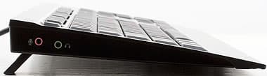 Но материал и дизайн корпуса являются не единственными излишествами модели. В ней также присутствует полноскоростной USB-хаб. Четырехпортовый, хотя на заднюю стенку выведено всего два порта. Один выход, разумеется, занимает сама клавиатура, а куда исчез последний? Отдан под полноценную USB-аудиокарту. Разъемов не дикие количества — только выход на наушники и микрофонный вход, но большего от клавиатуры как раз и не требуется.