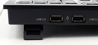 Впрочем, к вопросам энергопотребления мы еще вернемся, а пока закончим с хабом. Оба исходящих порта расположены на заднем торце клавиатуры, в правой ее части. Такое их местонахождение не очень удобно тем, что приходится лезть за клавиатуру. Особенно неприятно это, когда она стоит на выдвижной полке. Более удобным было бы расположение портов на боковинах клавиатуры — клинообразная форма это вполне позволяет. Правда, два рядом не поместятся, а напротив если… задний край левой боковины занят аудиоразъемами. Раз все и сразу не получается, пусть бы порты располагались под прямым углом друг к другу справа: один на задней грани, а второй — в уголке правой боковины. Так, на наш взгляд, было бы лучше.