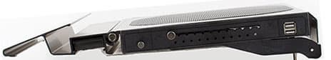 В задней части видны два USB-порта, что позволяет многим магазинам в описании товара указывать наличие USB-хаба в устройстве. На самом деле, хаба нет. Порт практически сквозной — только с него берется питание для встроенного вентилятора. Однако при этом вы не лишаетесь и самого порта, вот только подключать к нему что-либо требовательное к питанию не стоит. Но мышь или клавиатуру — без проблем. С другой стороны, лично мне кажется, что идея использовать для питания такого устройства именно USB достаточно оригинальна, но не слишком рациональна. Да, так дешевле, да и лишняя розетка не требуется. Но вот носить AirGear с собой вряд ли кто станет (все-таки 2 килограмма!), а для стационарного использования куда более удобным вариантом было бы питание от собственного блока питания и наличие полноценного активного USB-хаба порта так на четыре. Чтобы подключить к нему всю периферию сразу и, при установке ноутбука, просто подключать ее всю всего одним кабелем. В текущем же варианте без отдельного хаба обойтись сложно, так что будет еще и он на столе валяться.
