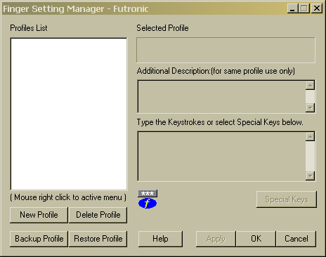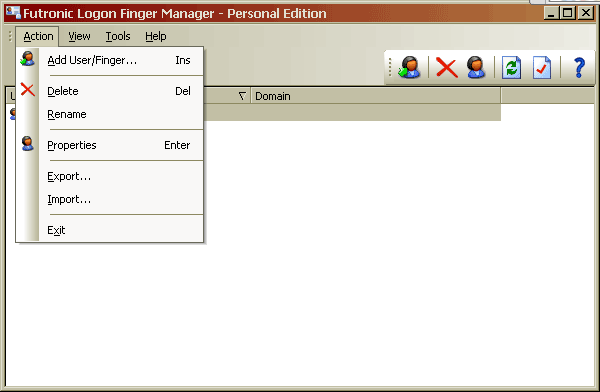 В меню Программы появился новый пункт: Futronic Logon, в котором содержится ссылка на всего лишь одно приложение: Finger Manager (а больше то и не надо, ага). Запускаем, смотрим интерфейс очень простой и понятный: