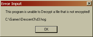 После выполнения процедуры шифрования папки не пропадают лишь добавляется расширение .ftr ко всем файлам внутри папки. В процессе обработки неосторожно выбранной большой папки мне это надоело и я нажал Cancel в результате половина файлов в папке получила выше указанные расширения, а половина осталась девственно нетронутой. Возжелав расшифровать все скопом я опять щелкнул на папке и выбрал Decrypt. Как только программа наткнулась на незашифрованные файлы, я имел счастье наблюдать следующее сообщение об ошибке:
