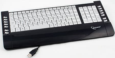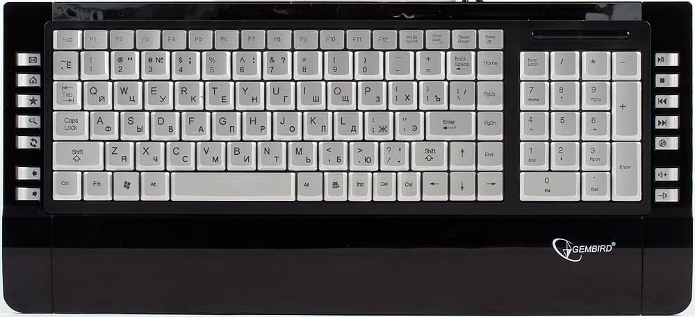 История клавиатур с подсветкой начиналась с компактных «зауженных» моделей, однако вскоре производители сумели предложить нам и варианты со стандартной раскладкой. Сейчас, похоже, история повторяется — размеры новой клавиатуры от Gembird составляют 429 х 195 мм. Глубина практически стандартная, пусть и немного непривычным образом распределена — кажется, что клавиши сдвинуты к верхней части, поскольку нижнюю занимает подставка для запястий (несмотря на «утонченность» модели, производитель позаботился о данном элементе, за что его можно только похвалить). А вот ширина меньше, чем у большинства клавиатур на 5-6 сантиметров, что было бы невозможным без существенной модификации клавишных блоков (о чем мы поговорим позднее подробно).