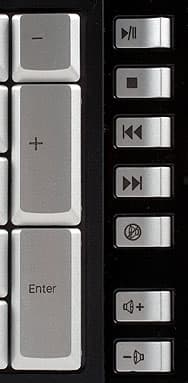Еще небольшое замечание к дизайну — клавиатура будет прекрасно смотреться на витрине магазина, да и дома во после уборки рабочего места, но если вам хочется, чтобы внешний вид был хорошим всегда, не забудьте приобрести специальную тряпочку. Дело в том, что подставка для запястий сделана из глянцевой черной пластмассы, такая же применена для боков (для окантовки блоков дополнительных клавиш), а над функциональными клавишами сверху помещена зеркальная полоска — все это вместе придает клавиатуре весьма броский и богатый вид, но мгновенно покрывается отпечатками пальцев и прочей грязью при использовании, что вид сразу несколько портит.