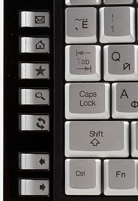 Обеспечением дополнительной функциональности занимаются 16 клавиш: упомянутые Wake Up и Fn, похожие по исполнению на основные, и 14 «совсем» дополнительных «рояльного» типа по бокам клавиатуры. Назначение их просто и привычно по недорогим моделям мультимедийных клавиатур, благо никакого программного обеспечения в комплекте нет, так что вся функциональность обеспечивается средствами операционной системы. Левая группа клавиш отвечает за работу с интернет-приложениями (почта, домашняя страница в браузере, «Избранное» IE, поиск IE или Windows, перезагрузка страницы), правая — мультимедийная (четыре управления плеерами и три — громкостью). Назначение Wake Up ясно из названия, а вот аналогов Fn я раньше не видел. Дело в том, что последняя кнопка, совместно с клавишами управления курсором или дополнительной цифровой клавиатуры, способна выполнять все операции 14-и дополнительных клавиш и даже чуть больше того (например, открывать папку «Мой компьютер» или запускать калькулятор, для чего отдельных кнопок нет). Интересно, конечно, но не очень понятно — зачем. Если такой вариант рассматривается как основной, то не лучше ли было отказаться от дополнительных клавиш и сделать основной блок более просторным. А если нет, то не лучше ли было убрать Fn и немного «расшить» тогда уж хотя бы нижний ряд. С другой стороны, возможно я и не прав. В конце-концов лишняя степень свободы выбора редко когда бывает действительно лишней :)