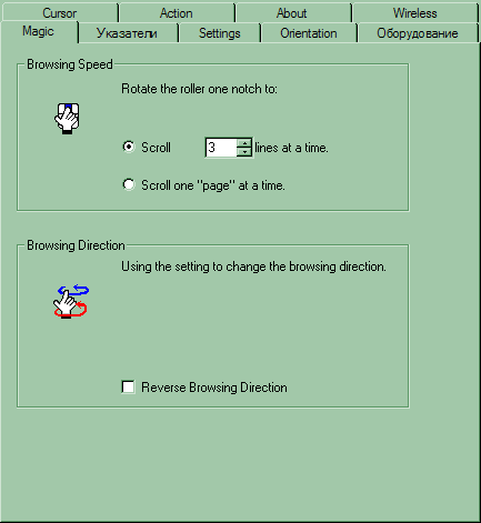 Первая закладка управляет колесиком прокрутки. Ничего особо интересного тут нет привычный набор настроек. Замечу кстати, что в «родном» режиме мышь прекрасно прокручивает и неактивные окна, что так нравится очень многим пользователям. Особенно это удобно в тех случаях, когда вы читаете что-то большее во время выполнения длительного процесса, уверенного в том, что свой индикатор следует в обязательном порядке держать на переднем плане (чаще всего этим страдают программы для работы со сканерами).