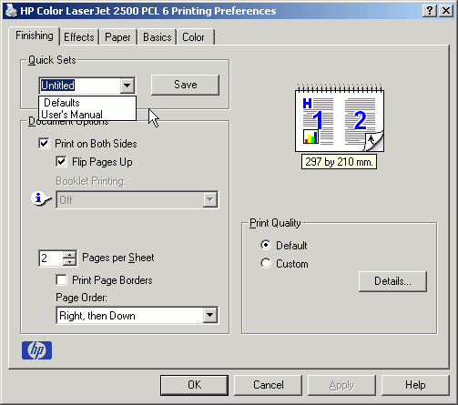 Теперь на примере драйверов версии для PCL6 ознакомимся с ключевыми настройками модели. Закладка «Finishing» (в русской версии драйверов «Окончательная обработка») позволяет определить базовые настройки вывода на печать: двухстороннюю печать, переворот страницы, печать буклета, вывод нескольких страниц на одном листе, установки качества печати. При желании, настроенный профиль может быть сохранен для последующего использования.