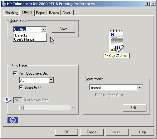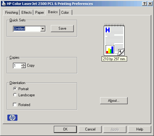 Закладка Basics позволяет установить горизонтальную или вертикальную ориентацию бумаги, задать количество копий или печать с поворотом.