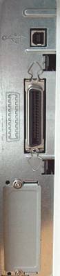 Таким образом выглядит тыльная сторона принтера: здесь расположены интерфейсные порты, отсек доступа к слоту расширения EIO, разъем для подключения кабеля питания.
