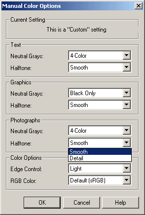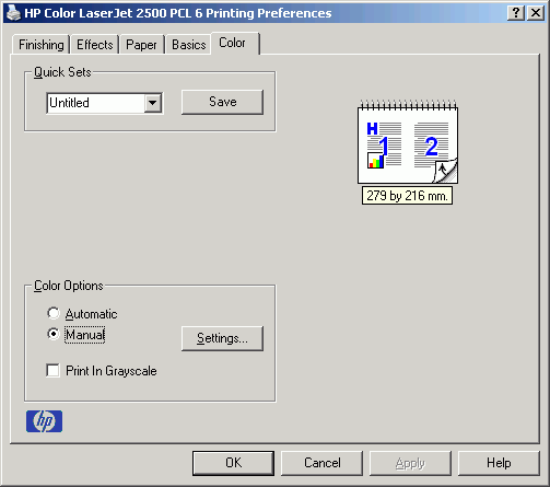 Помимо установки параметров в автоматический режим или в монохромный режим печати, можно настроить параметры вывода цвета вручную, для чего служит дополнительная закладка Settings (Установки):